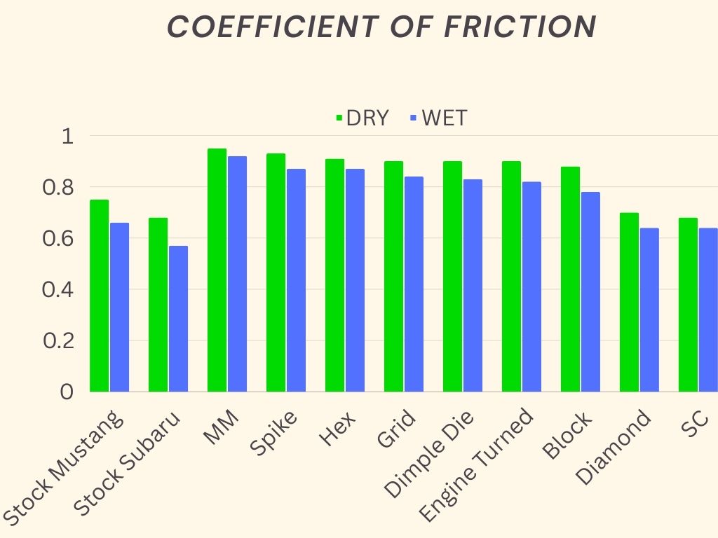 Wet and dry static coefficient of friction of our pedal collection versus a new Mustang rubber cover and an old Subaru cover. Remember, higher is not always better!